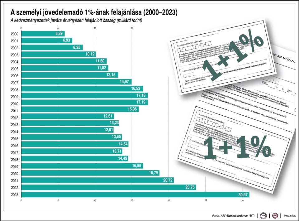 A személyi jövedelemadó bevallását idén május 20-ig kell megtenni, és ugyanez a határidő vonatkozik a 1+1 százalékok felajánlására is – hívta fel a figyelmet a Nemzeti Adó- és Vámhivatal (NAV). Az adóhivatal kiemelte, hogy az idén is mindenki szabadon rendelkezhet befizetett adója 1+1 százalékáról, az egyik 1 százalék egy civil szervezetnek, további 1 százalék pedig valamely vallási közösségnek, vagy a Nemzeti Tehetség Programnak ajánlható fel.