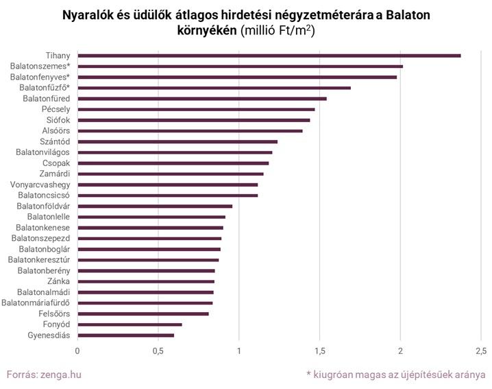 A legdrágább település továbbra is Tihany, ahol közel 2,4 millió forintos négyzetméteráron hirdetik a nyaralókat, de szintén a 2 millió forintos átlagos hirdetési négyzetméterár közelében van Balatonszemes és Balatonfenyves is, ami a sok partközeli vagy újépítésű, kiemelkedően drága ingatlannak köszönhető.